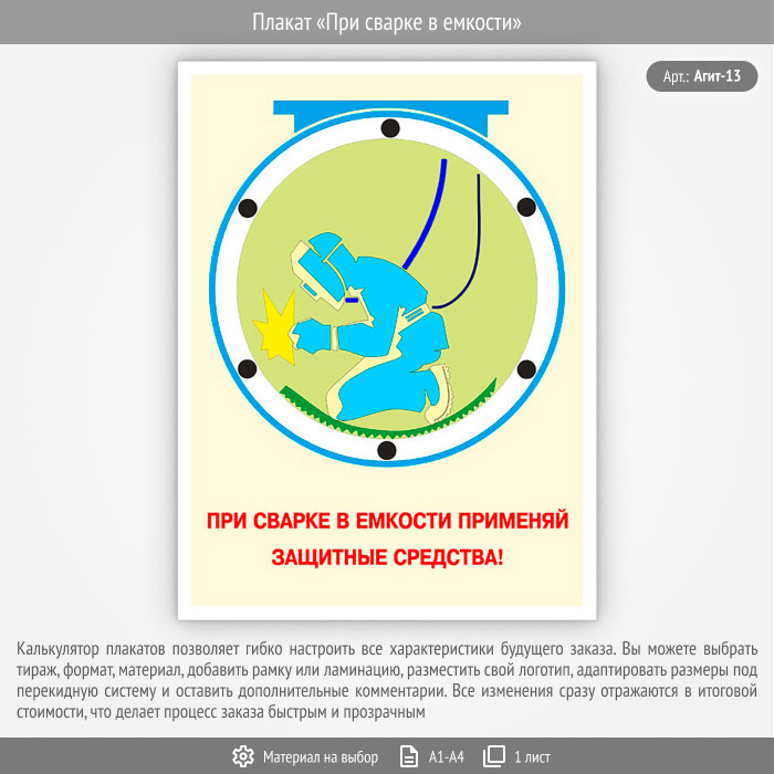 Плакат «При сварке в емкости» (Агит-13, 1 лист) в Ачинске купить