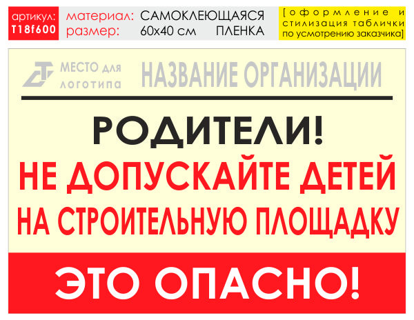Баннер «Родители!» (T18) может быть изготовен в различных размерах на самоклеящейся плёнке, ПВХ-пластике или баннерной ткани (а также на металле - под заказ) как по нашему, так и по Вашему макету или эскизу. В цену баннера включены: разработка и согласование макета, а также изготовление и упаковка. Изготавливаем таблички любых размеров и на любом материале (включая и металл) по Вашим макетам и эскизам