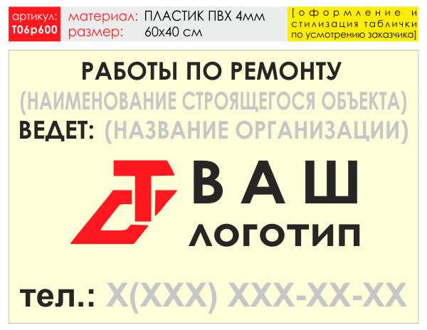 Баннер «Работы по ремонту», T06 (пластик 4 мм, 60х40 см) в Ачинске купить
