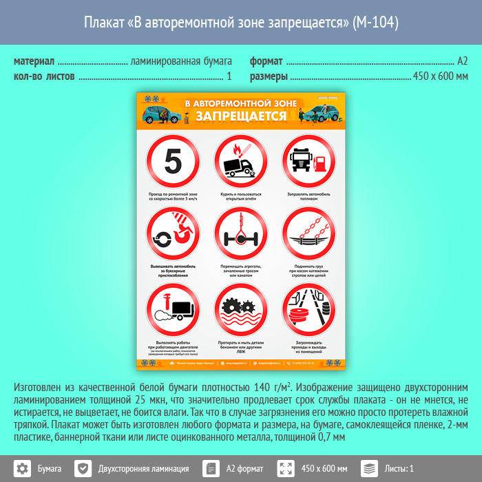 Плакат «В авторемонтной зоне запрещается» (М-104, ламинированная бумага, А2, 1 лист) в Ачинске купить