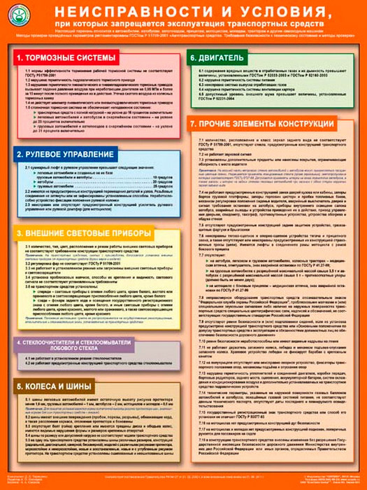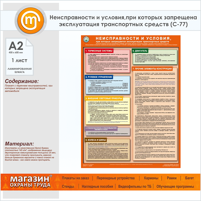 Плакат «Неисправности и условия, при которых запрещена эксплуатация транспортных средств» (С-77, ламинированная бумага, А2, 1 лист) в Ачинске купить