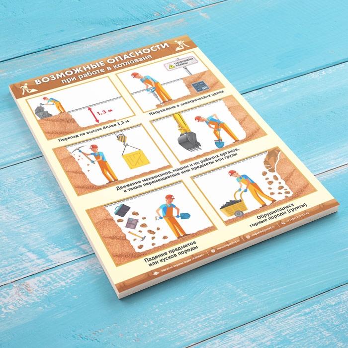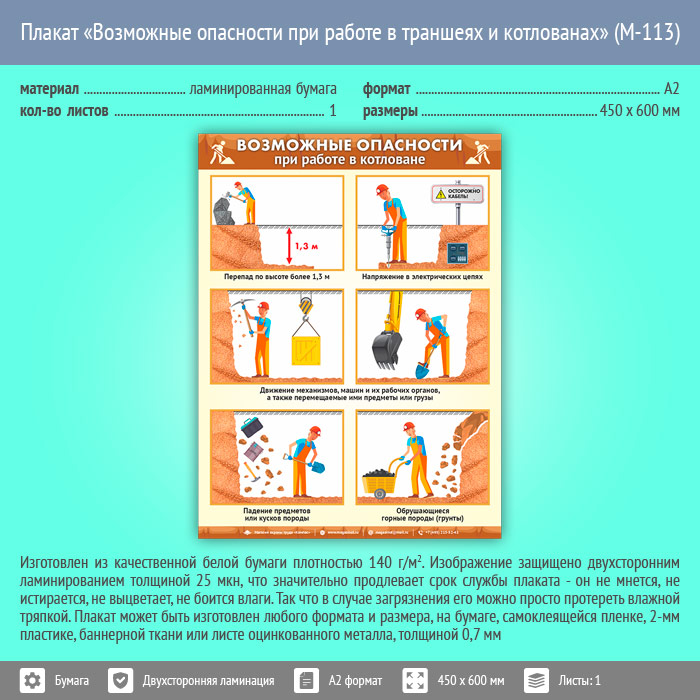 Плакат «Возможные опасности при работе в траншеях и котлованах» (М-113, ламинированная бумага, А2, 1 лист) в Ачинске купить