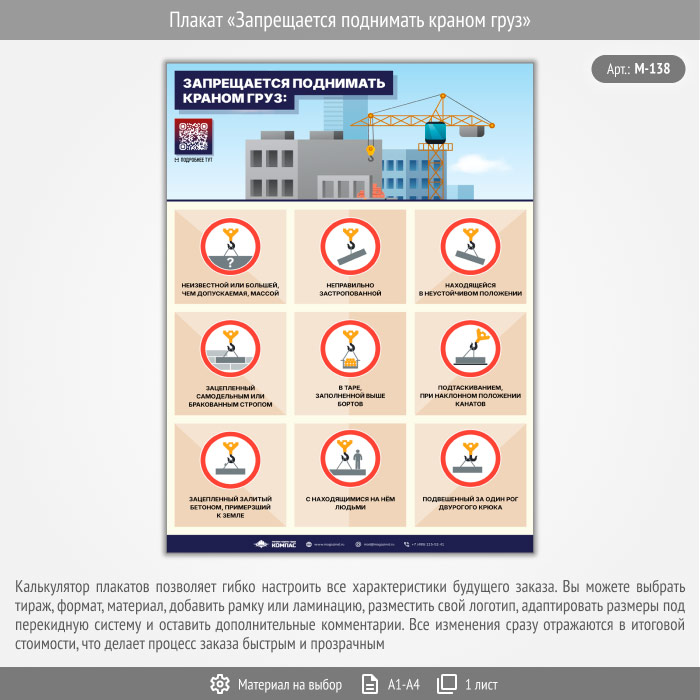 Плакат «Запрещается поднимать краном груз» с QR (М-138, 1 лист) в Ачинске купить