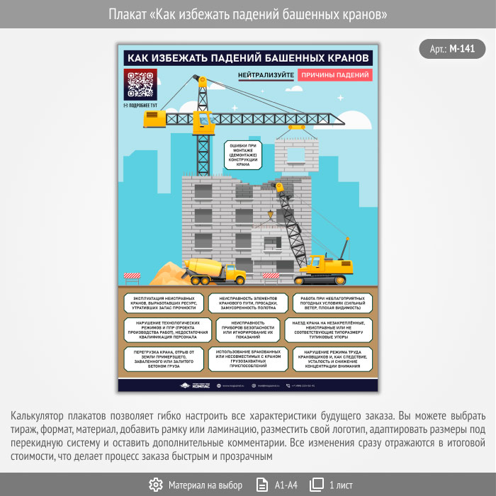 Плакат «Как избежать падений башенных кранов» с QR (М-141, 1 лист) в Ачинске купить