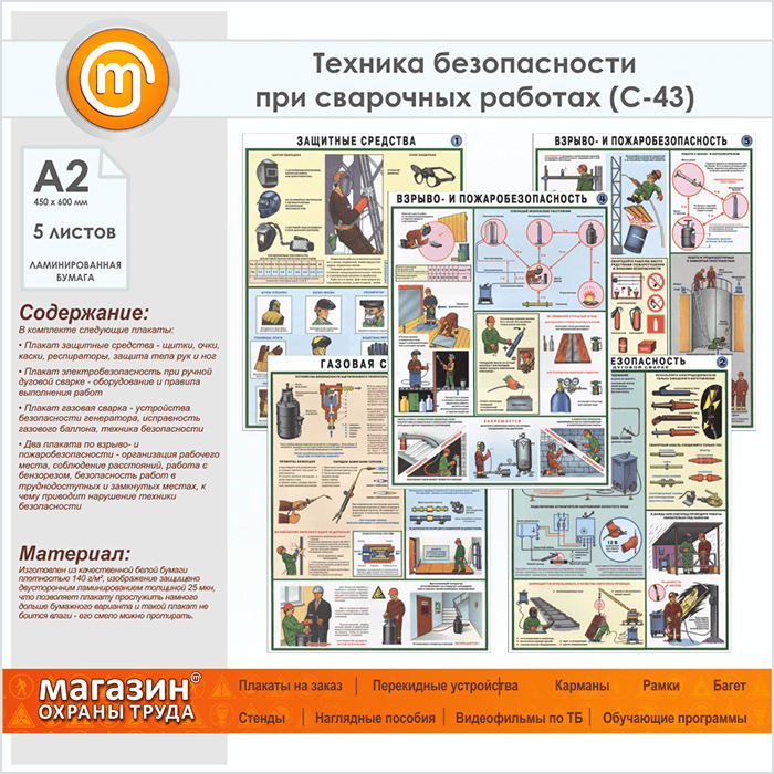 Плакаты «Техника безопасности при сварочных работах» (С-43, ламинированная бумага, А2, 5 листов) в Ачинске купить