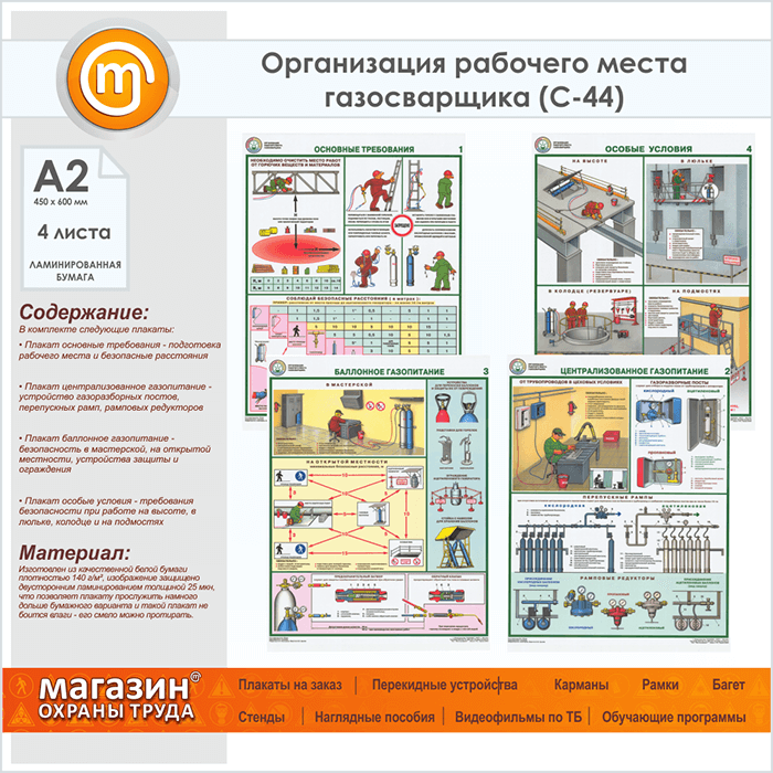 Плакаты «Организация рабочего места газосварщика» (С-44, ламинированная бумага, А2, 4 листа) в Ачинске купить