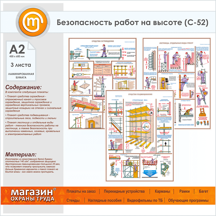 Плакаты «Безопасность работ на высоте» (С-52, ламинированная бумага, А2, 3 листа) в Ачинске купить