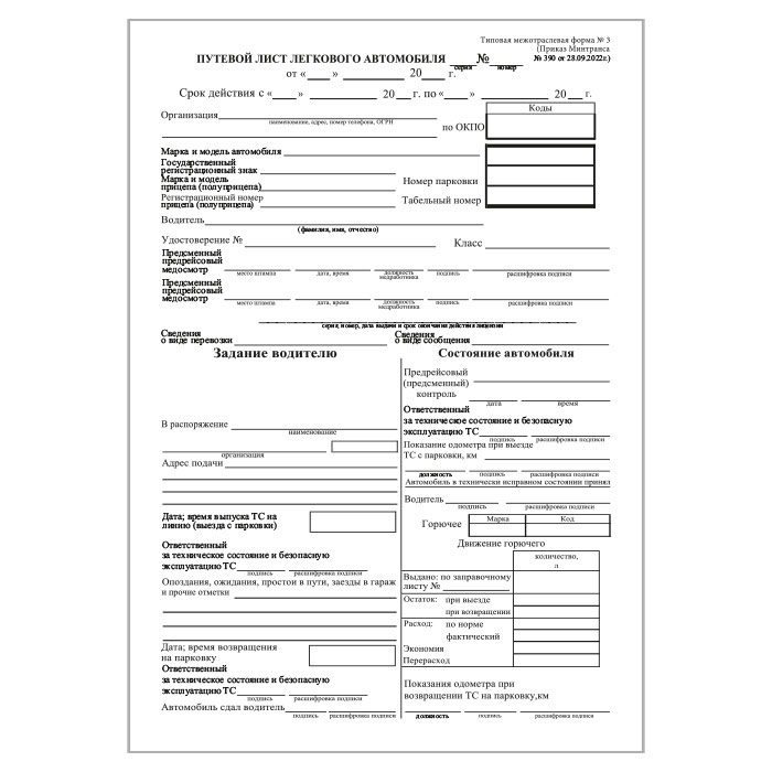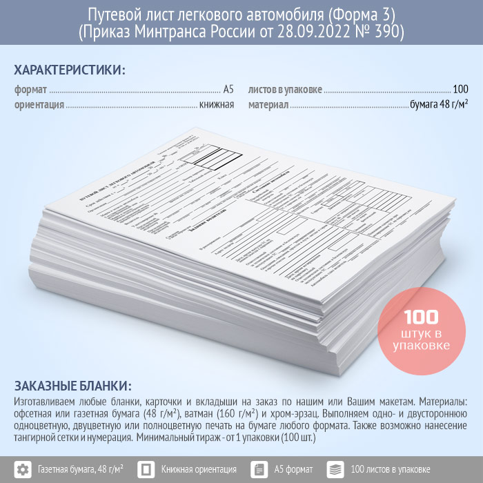 Путевой лист легкового автомобиля (Форма № 3) (Приказ Минтранса России от 28.09.2022 № 390) (упаковка из 100 штук) в Ачинске купить