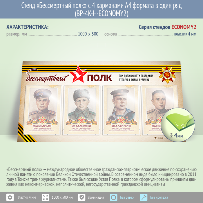 Стенд «Бессмертный полк» с 4 карманами А4 формата в один ряд (BP-4K-H-ECONOMY2) в Ачинске купить