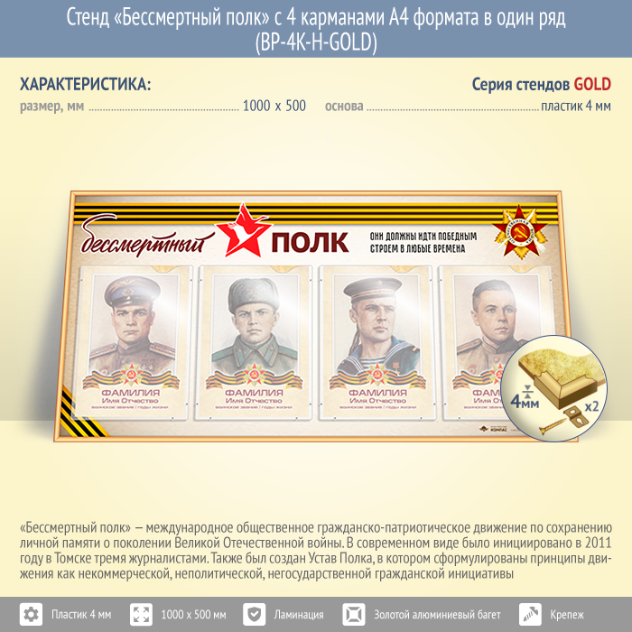 Стенд «Бессмертный полк» с 4 карманами А4 формата в один ряд (BP-4K-H-GOLD) в Ачинске купить