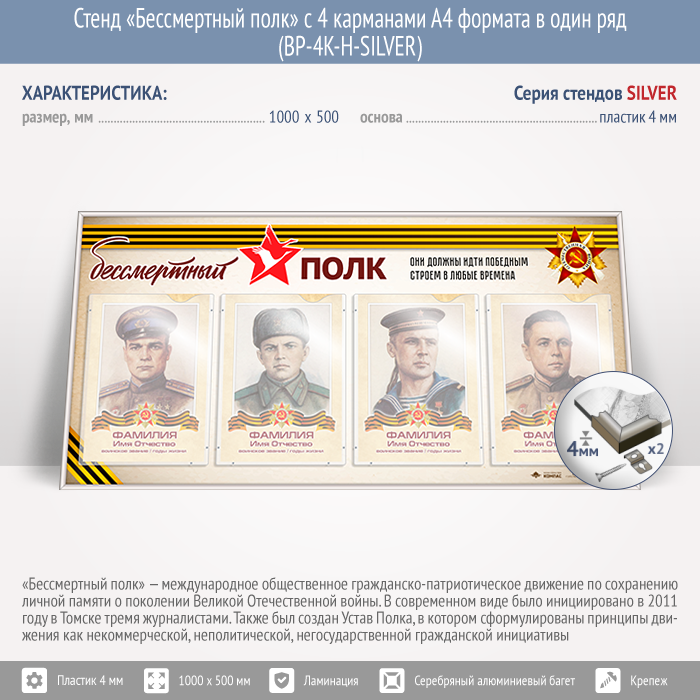Стенд «Бессмертный полк» с 4 карманами А4 формата в один ряд (BP-4K-H-SILVER) в Ачинске купить