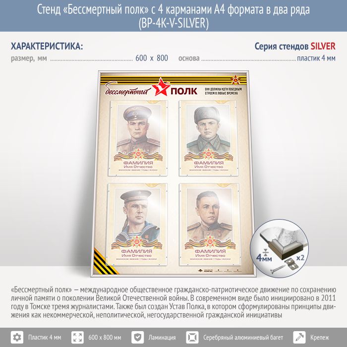 Стенд «Бессмертный полк» с 4 карманами А4 формата в два ряда (BP-4K-V-SILVER) в Ачинске купить