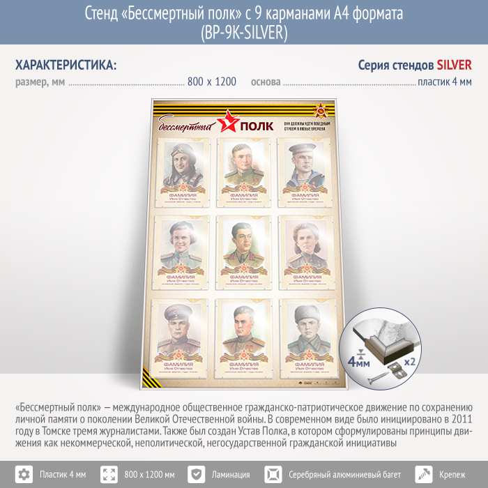 Стенд «Бессмертный полк» с 9 карманами А4 формата (BP-9K-SILVER) в Ачинске купить