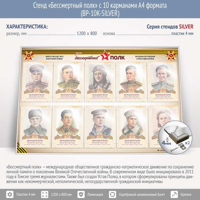 Стенд «Бессмертный полк» с 10 карманами А4 формата (BP-10K-SILVER) в Ачинске купить