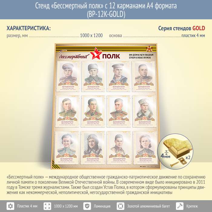 Стенд «Бессмертный полк» с 12 карманами А4 формата (BP-12K-GOLD) в Ачинске купить