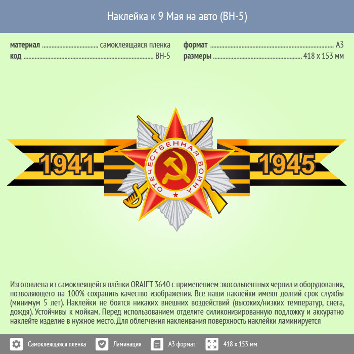 Наклейка к 9 Мая на авто А3 формата (BH-5) в Ачинске купить