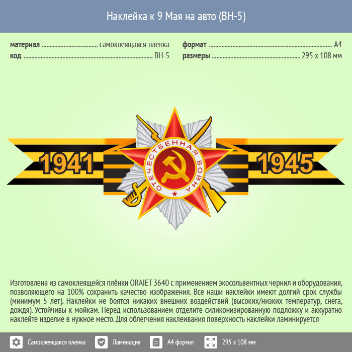 Наклейка к 9 Мая на авто А4 формата (BH-5) в Ачинске купить