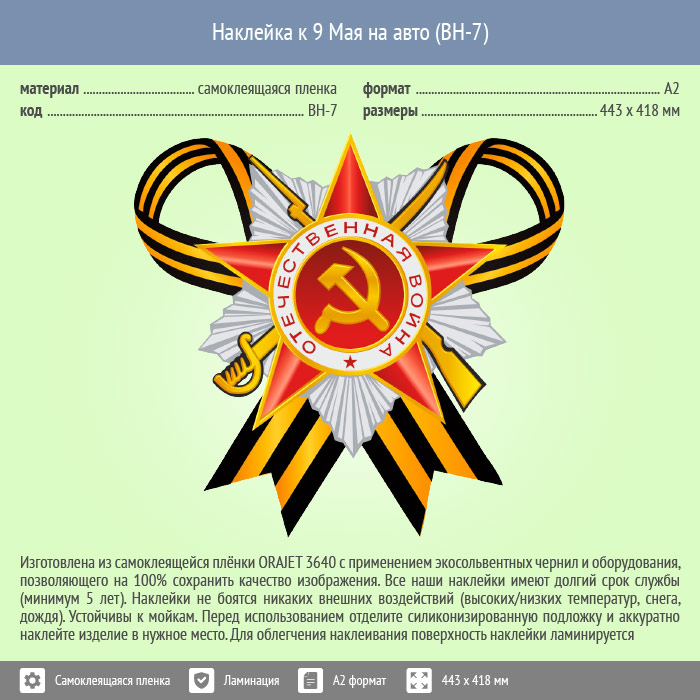 Наклейка к 9 Мая на авто А2 формата (BH-7) в Ачинске купить