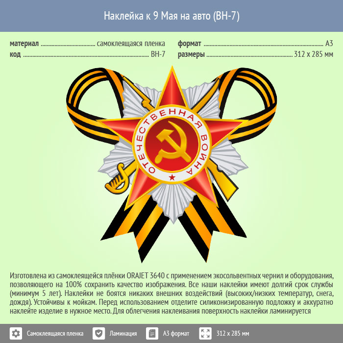 Наклейка к 9 Мая на авто А3 формата (BH-7) в Ачинске купить
