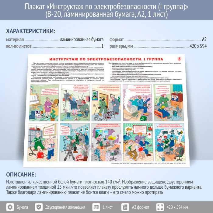 Плакат «Инструктаж по электробезопасности (I группа)» (В-20, ламинированная бумага, А2, 1 лист) в Ачинске купить