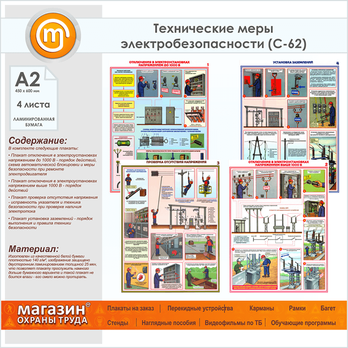 Плакаты «Технические меры электробезопасности» (С-62, ламинированная бумага, А2, 4 листа) в Ачинске купить