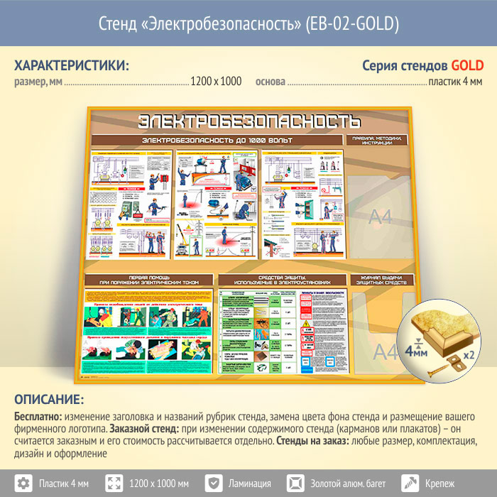 Стенд «Электробезопасность до 1000 вольт» с плоским и объемным карманами (EB-02-GOLD) в Ачинске купить