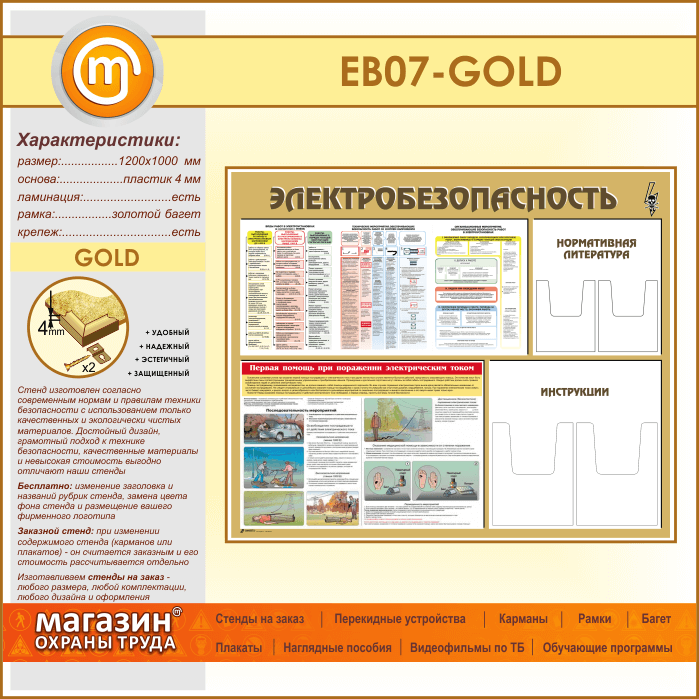 Стенд «Электробезопасность» с 4 объемными карманами (EB-07-GOLD) в Ачинске купить