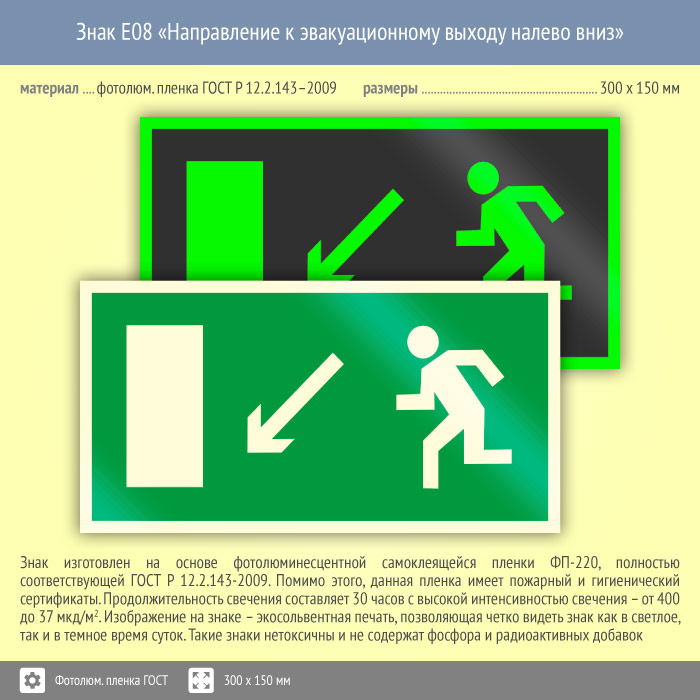 Знак E08 «Направление к эвакуационному выходу налево вниз» (фотолюминесцентная пленка ГОСТ 34428-2018, 300х150 мм) в Ачинске купить