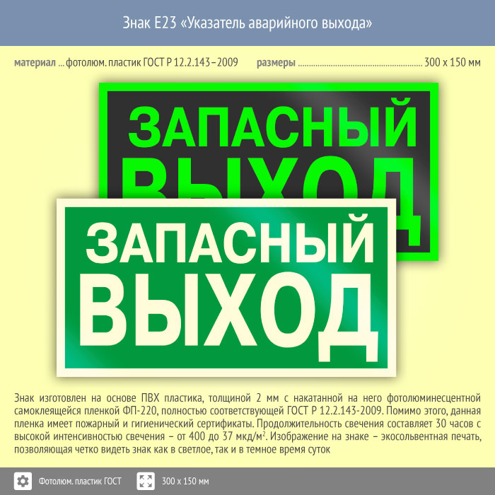 Знак E23 «Указатель запасного выхода» (устаревший) (фотолюминесцентный пластик ГОСТ 34428-2018, 300х150 мм) в Ачинске купить