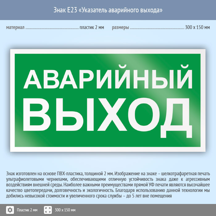 Знак E23 «Указатель аварийного выхода» (пластик, 300х150 мм) в Ачинске купить