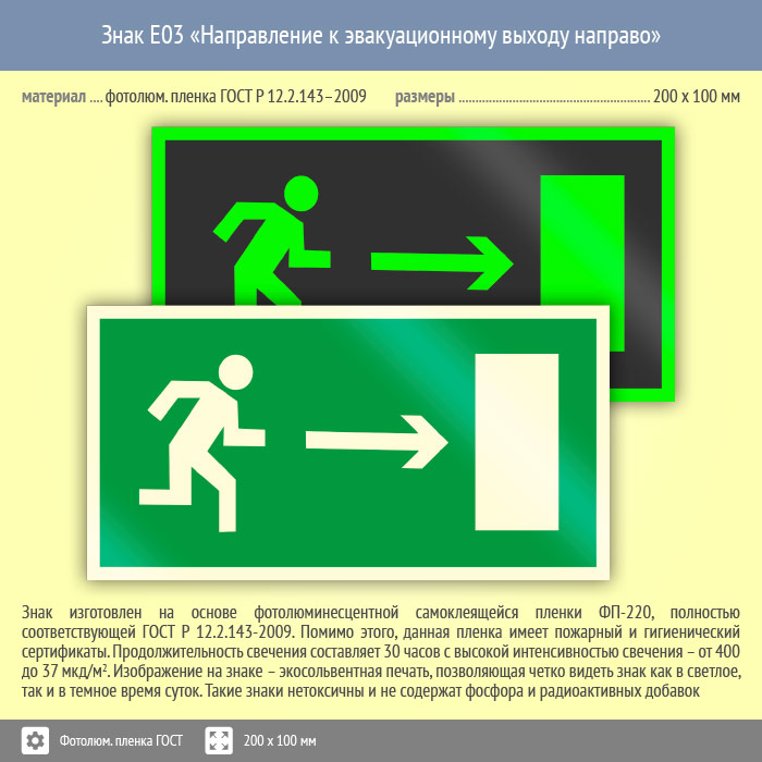 Знак E03 «Направление к эвакуационному выходу направо» (фотолюминесцентная пленка ГОСТ 34428-2018, 200х100 мм) в Ачинске купить