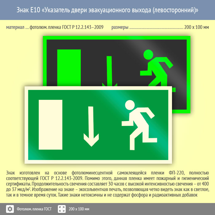 Знак E10 «Указатель двери эвакуационного выхода (левосторонний)» (фотолюминесцентная пленка ГОСТ 34428-2018, 200х100 мм) в Ачинске купить