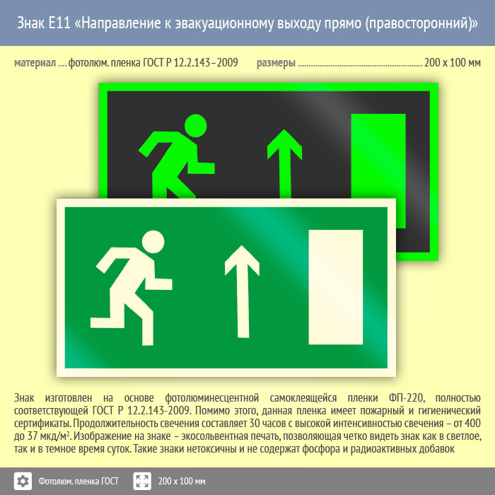 Знак E11 «Направление к эвакуационному выходу прямо (правосторонний)» (фотолюминесцентная пленка ГОСТ 34428-2018, 200х100 мм) в Ачинске купить