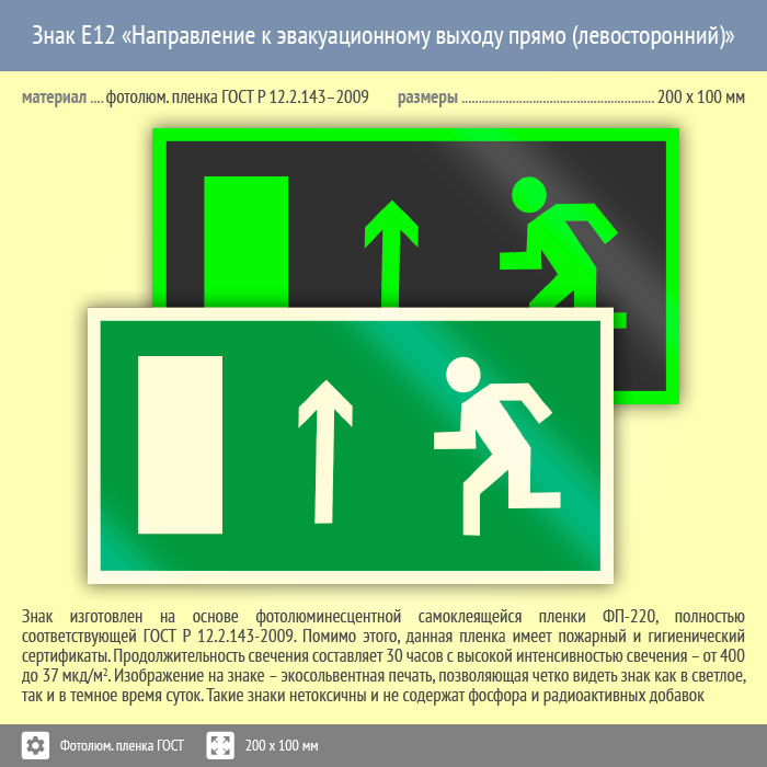 Знак E12 «Направление к эвакуационному выходу прямо (левосторонний)» (фотолюминесцентная пленка ГОСТ 34428-2018, 200х100 мм) в Ачинске купить
