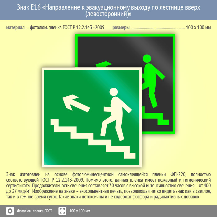 Знак E16 «Направление к эвакуационному выходу по лестнице вверх (левосторонний)» (фотолюминесцентная пленка ГОСТ 34428-2018, 100х100 мм) в Ачинске купить