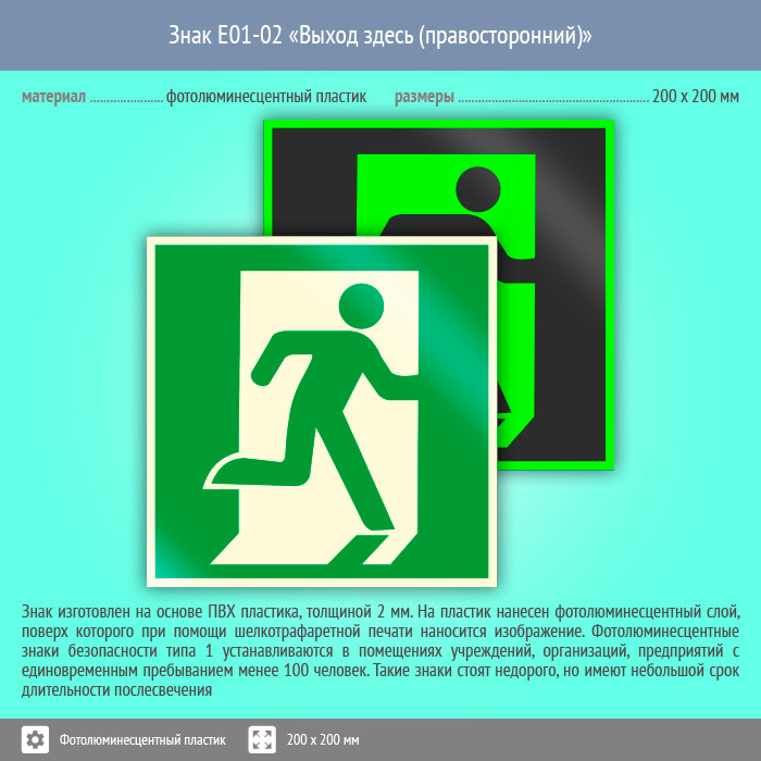 Знак E01-02 «Выход здесь (правосторонний)» (фотолюминесцентный пластик, 200х200 мм) в Ачинске купить