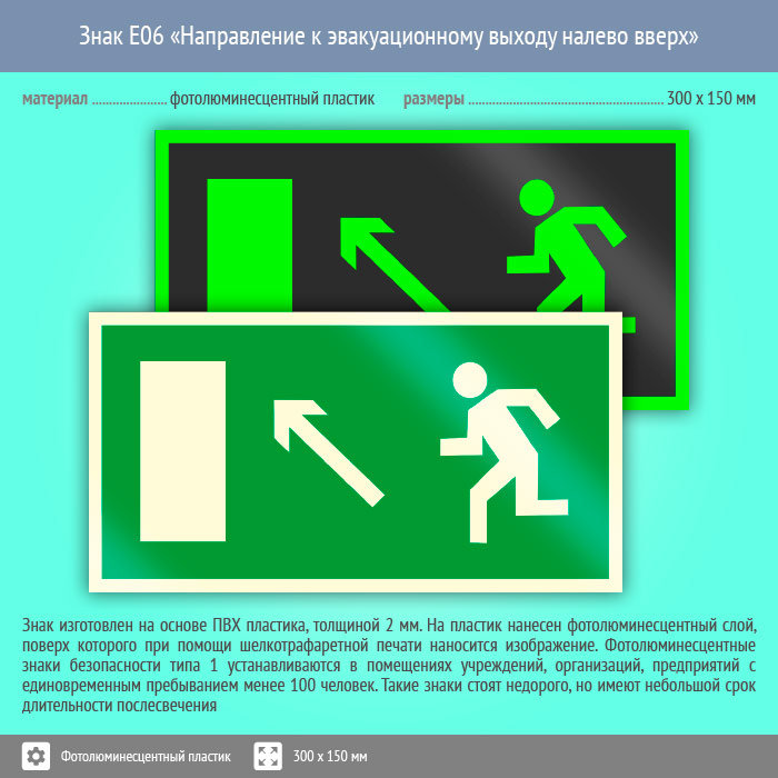 Знак E06 «Направление к эвакуационному выходу налево вверх» (фотолюминесцентный пластик, 300х150 мм) в Ачинске купить