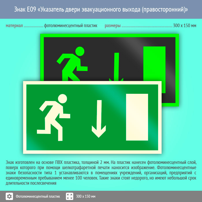 Знак E09 «Указатель двери эвакуационного выхода (правосторонний)» (фотолюминесцентный пластик, 300х150 мм) в Ачинске купить