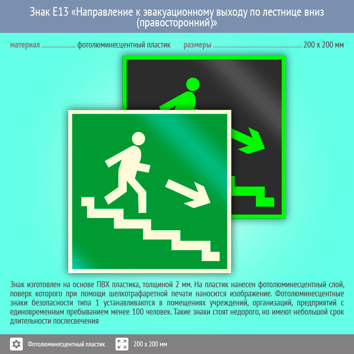 Знак E13 «Направление к эвакуационному выходу по лестнице вниз (правосторонний)» (фотолюминесцентный пластик, 200х200 мм) в Ачинске купить