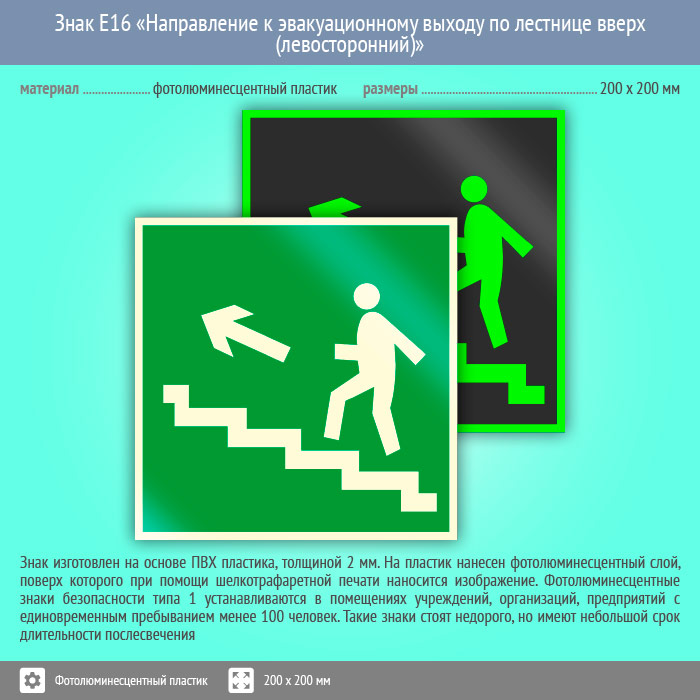 Знак E16 «Направление к эвакуационному выходу по лестнице вверх (левосторонний)» (фотолюминесцентный пластик, 200х200 мм) в Ачинске купить