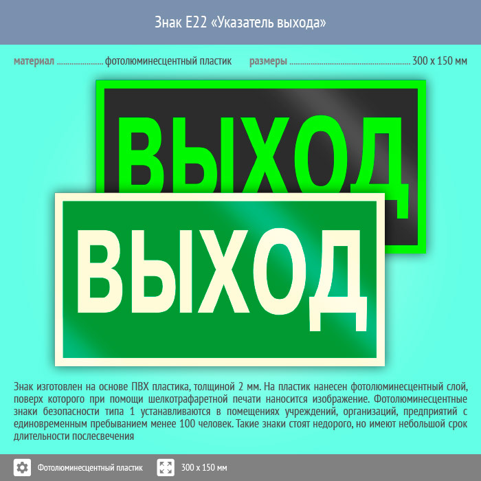 Знак E22 «Указатель выхода» (фотолюминесцентный пластик, 300х150 мм) в Ачинске купить