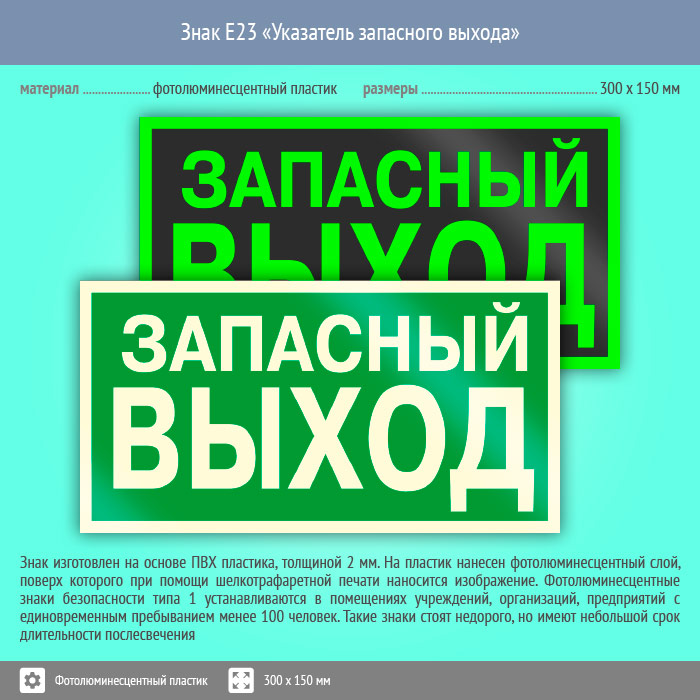 Знак E23 «Указатель запасного выхода» (устаревший) (фотолюминесцентный пластик, 300х150 мм) в Ачинске купить