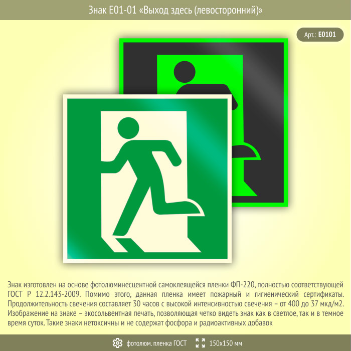 Знак E01-01 «Выход здесь (левосторонний)» (фотолюминесцентная пленка ГОСТ 34428-2018, 150х150 мм) в Ачинске купить
