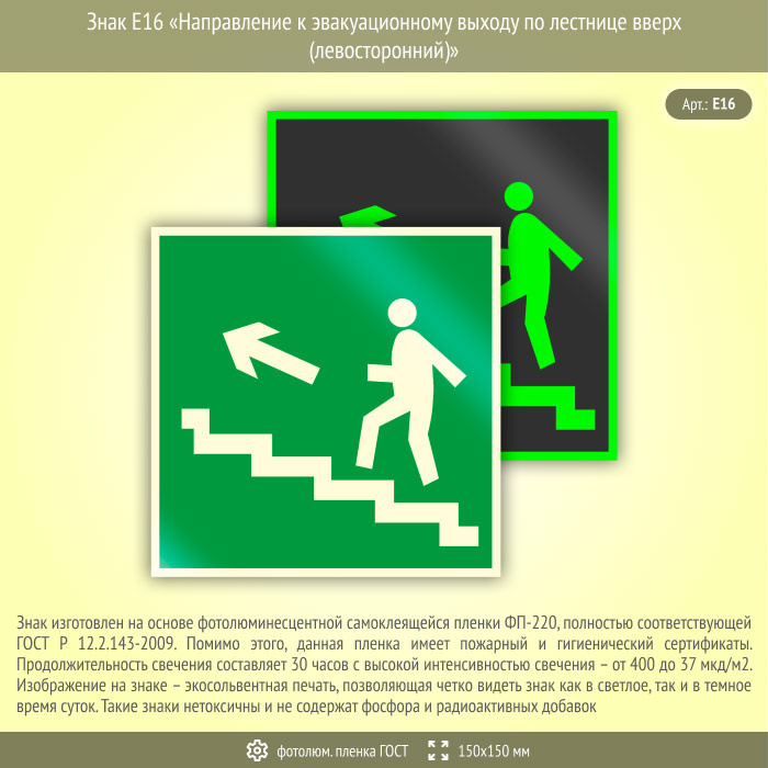 Знак E16 «Направление к эвакуационному выходу по лестнице вверх (левосторонний)» (фотолюминесцентная пленка ГОСТ 34428-2018, 150х150 мм) в Ачинске купить