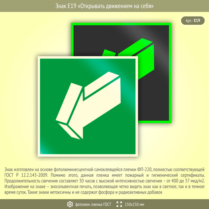 Знак E19 «Открывать движением на себя» (фотолюминесцентная пленка ГОСТ 34428-2018, 150х150 мм) в Ачинске купить