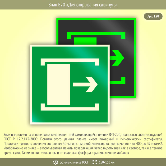 Знак E20 «Для открывания сдвинуть» (фотолюминесцентная пленка ГОСТ 34428-2018, 150х150 мм) в Ачинске купить