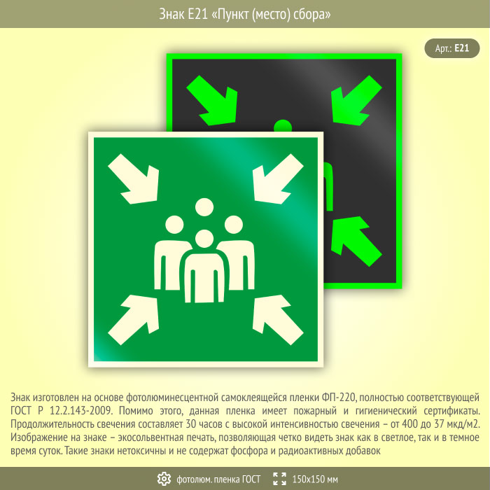 Знак E21 «Пункт (место) сбора» (фотолюминесцентная пленка ГОСТ 34428-2018, 150х150 мм) в Ачинске купить