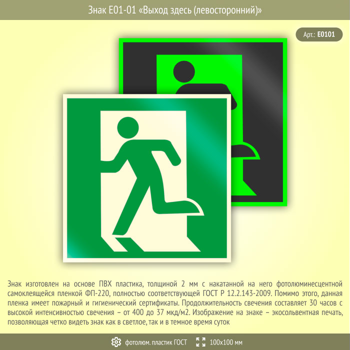 Знак E01-01 «Выход здесь (левосторонний)» (фотолюминесцентный пластик ГОСТ 34428-2018, 100х100 мм) в Ачинске купить