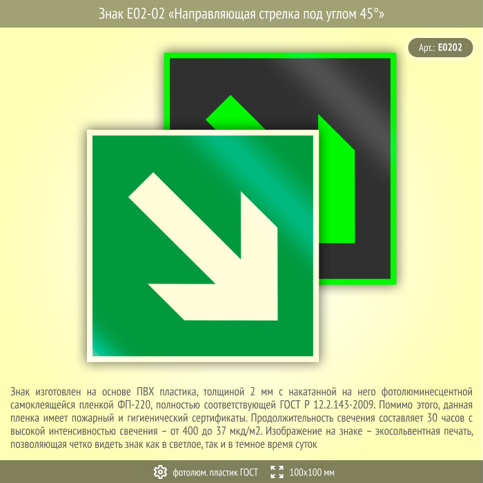 Знак E02-02 «Направляющая стрелка под углом 45°» (фотолюминесцентный пластик ГОСТ 34428-2018, 100х100 мм) в Ачинске купить
