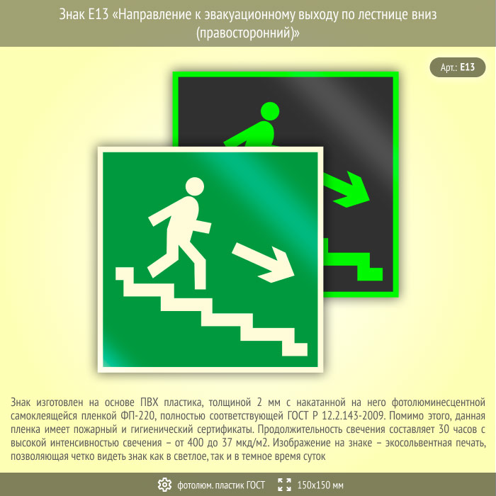 Знак E13 «Направление к эвакуационному выходу по лестнице вниз (правосторонний)» (фотолюминесцентный пластик ГОСТ 34428-2018, 150х150 мм) в Ачинске купить